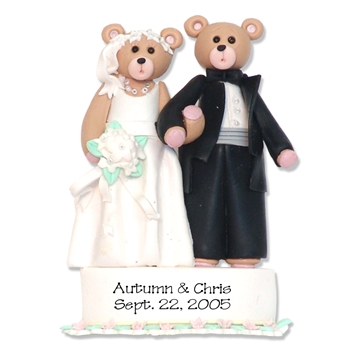 From Deb & Co.'s Wedding Collection this ornament is handmade from polymer clay. It is extremely detailed. The trim on the dress is beaded along with her veil. The bride and groom are attached to the cake. What a wonderful way to remember your wedding every year as you hang it on your Christmas tree! Each and every ornament is designed by Debi Allison and all of our personalized ornaments are exquisitely handcrafted and detailed from polymer clay. Absolutely no molds are used!