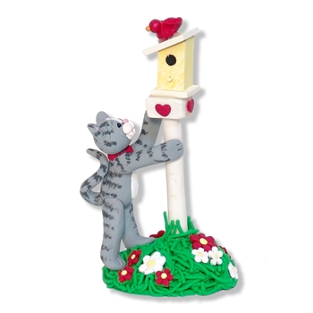 Gray Kitty Cat with Bird & Birdhouse Handmade Figurine