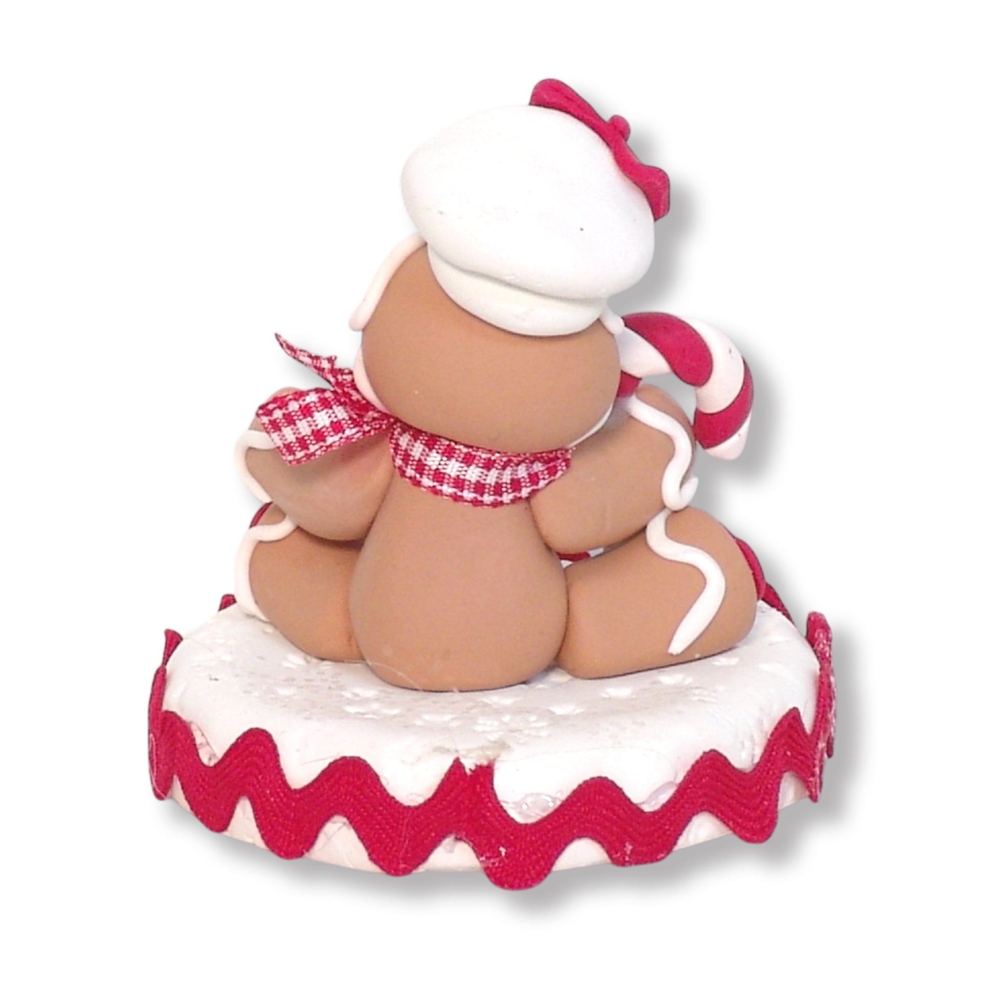 This is a darling little gingerbread figurine. He is sitting on a Polymer base holding a candy cane. It is handmade from polymer clay. It is a 3-dimensional figurine and does NOT have a hook for hanging. It looks great sitting on a shelf or mantel or as a tiered tray decoration.