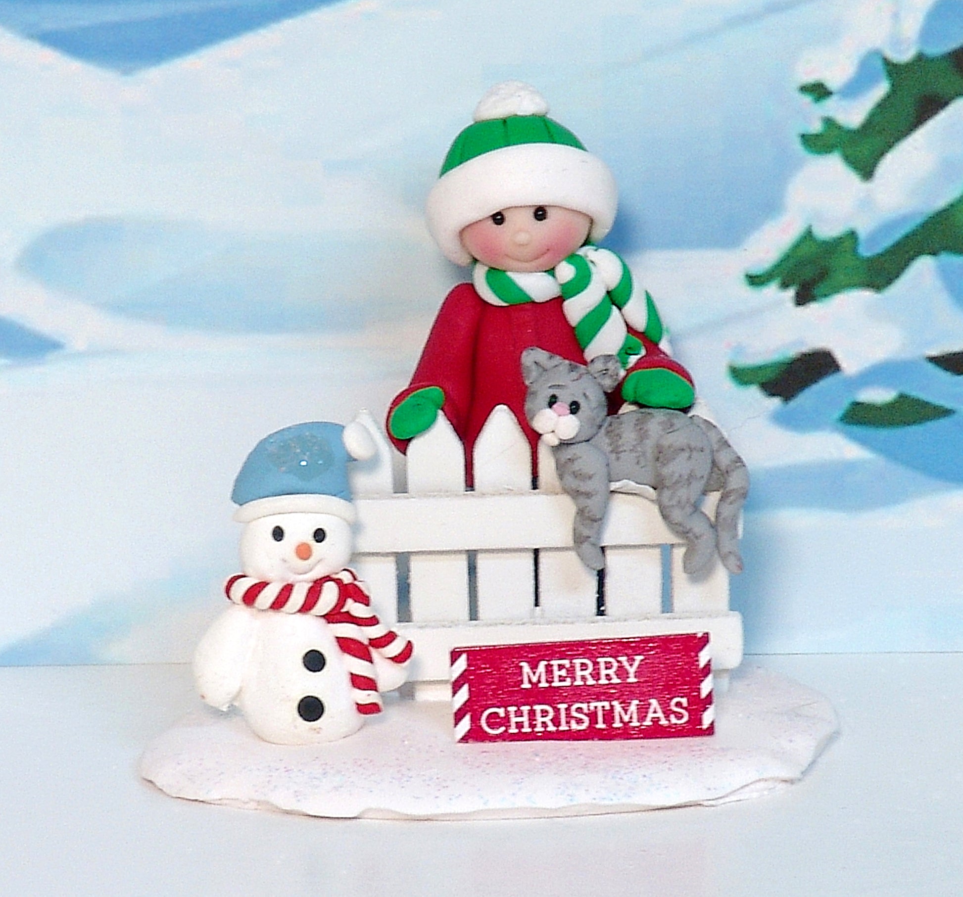 This darling little Giggle Gang kid with it's gray kitten is perfect for any one little kid who just got or is about to receive a new kitten. It is a 3-dimensional figurine, handmade from polymer clay by me and DOES NOT have a hook for hanging. It may be personalized with a name on the hat.