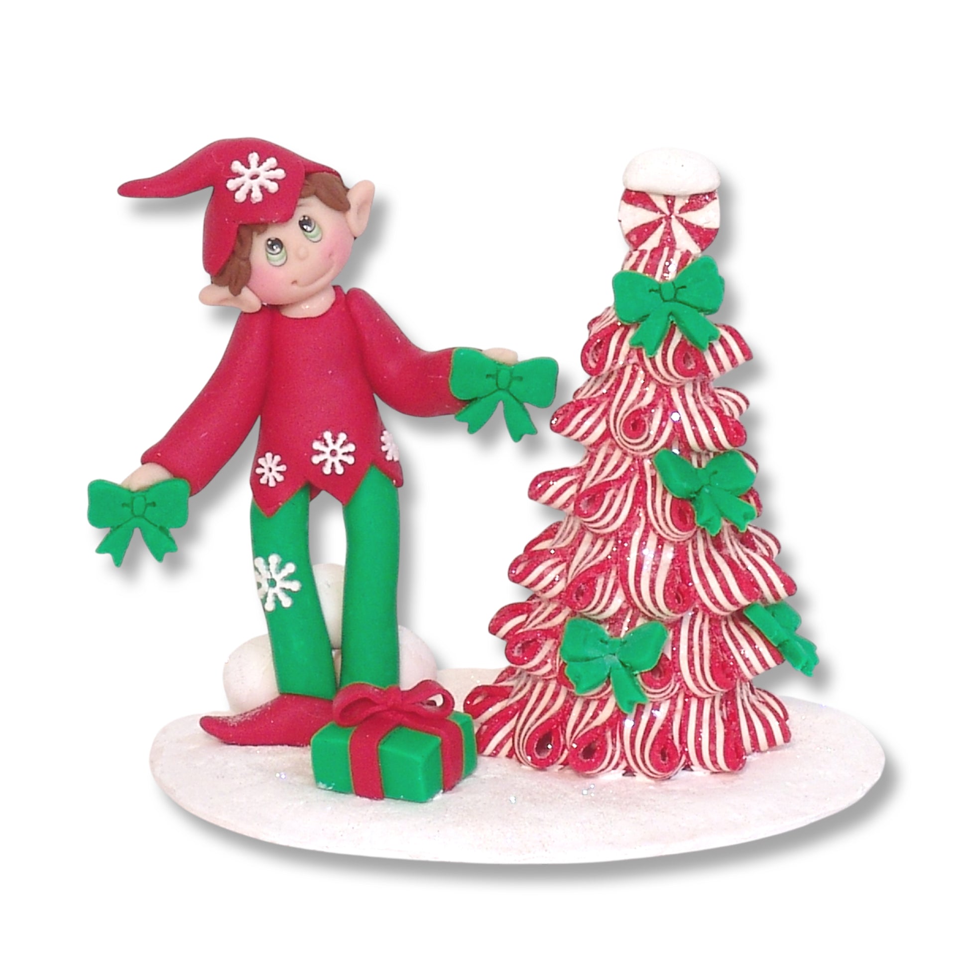 This little elf and his peppermint tree are great for any Christmas tiered tray or shelf decor. It is handmade from polymer clay by me. It looks great on a mantel, shelf or tabletop.